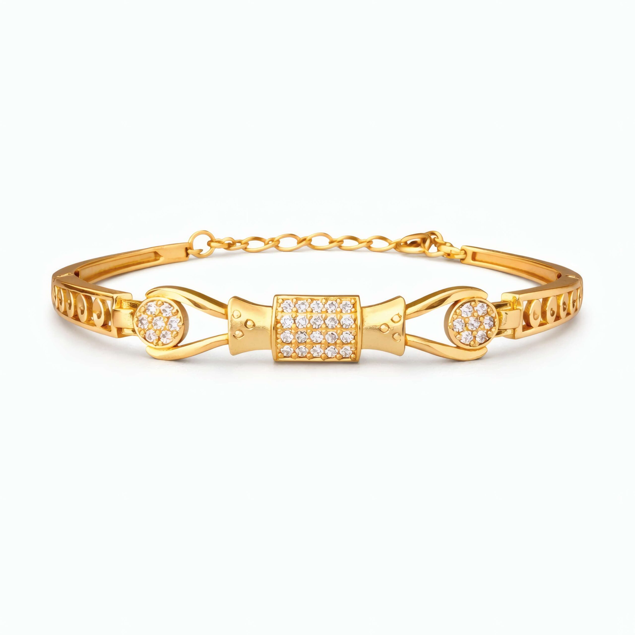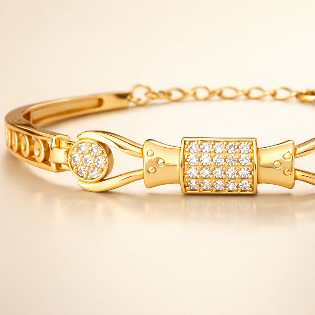 Inspired by modern elegance and timeless feminine beauty, this designer bracelet is crafted to add a touch of refined sparkle to your jewellery collection. The sleek gold finish beautifully highlights the shimmering crystal-studded center, creating a balanced design that feels both graceful and contemporary.