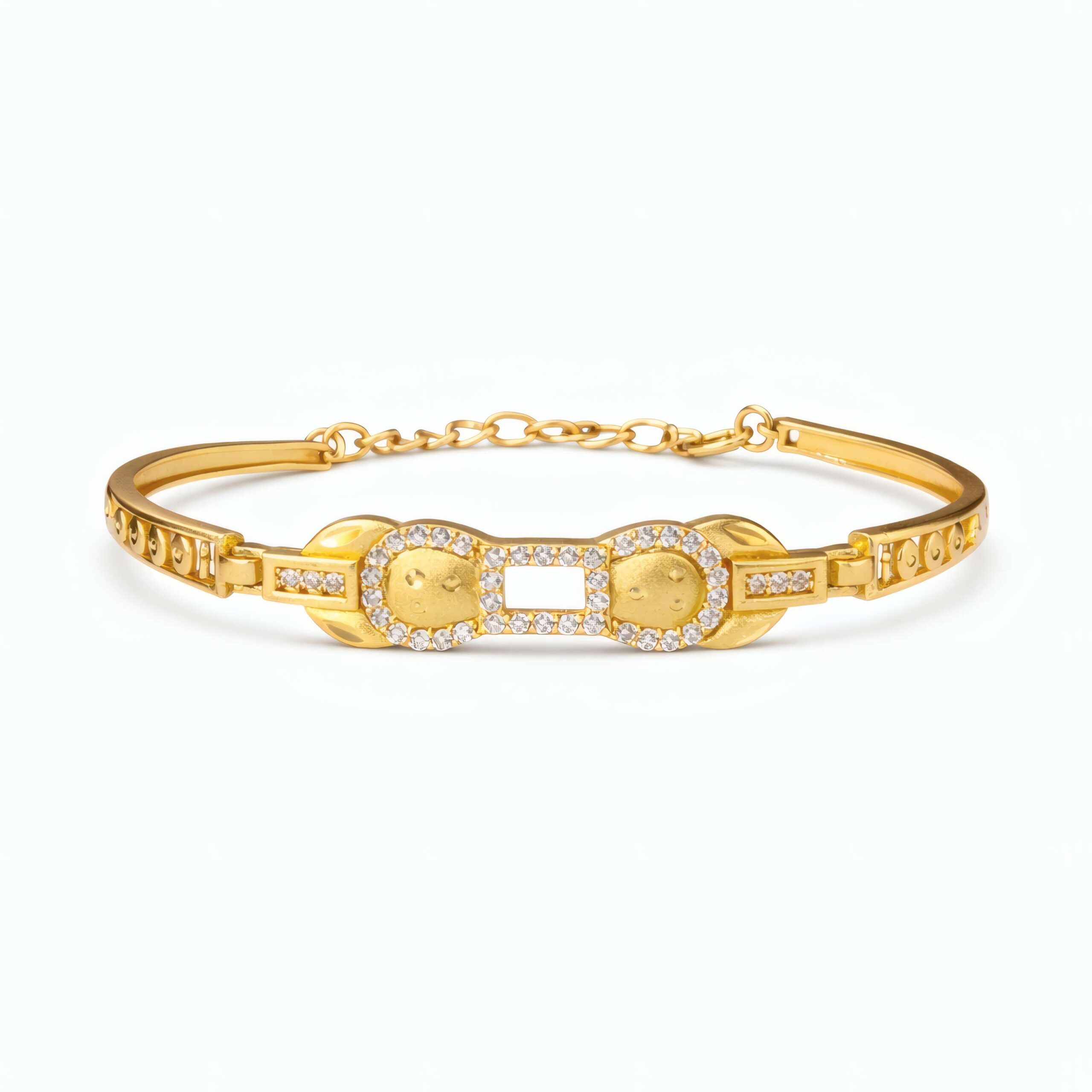 At the center, a sleek rectangular crystal frame adds a contemporary element, beautifully connecting the two circular accents and giving the bracelet a unique geometric charm. The polished gold finish enhances the intricate detailing, creating a luxurious look that feels both stylish and refined.