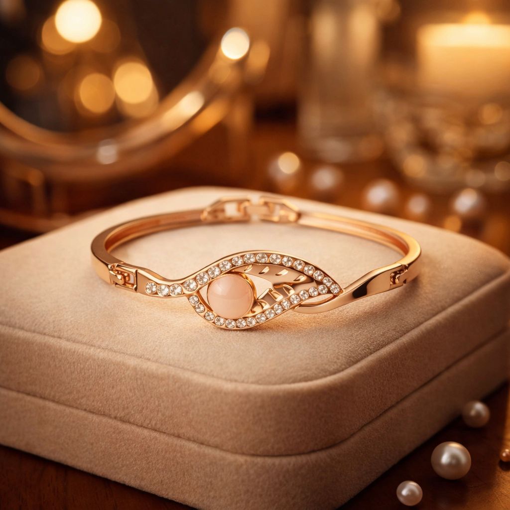 Inspired by modern elegance and graceful design, this stunning gold bracelet features a beautifully crafted eye-shaped motif that symbolizes charm, beauty, and protection. At the heart of the design sits a soft blush pink stone that adds a gentle touch of femininity and sophistication.