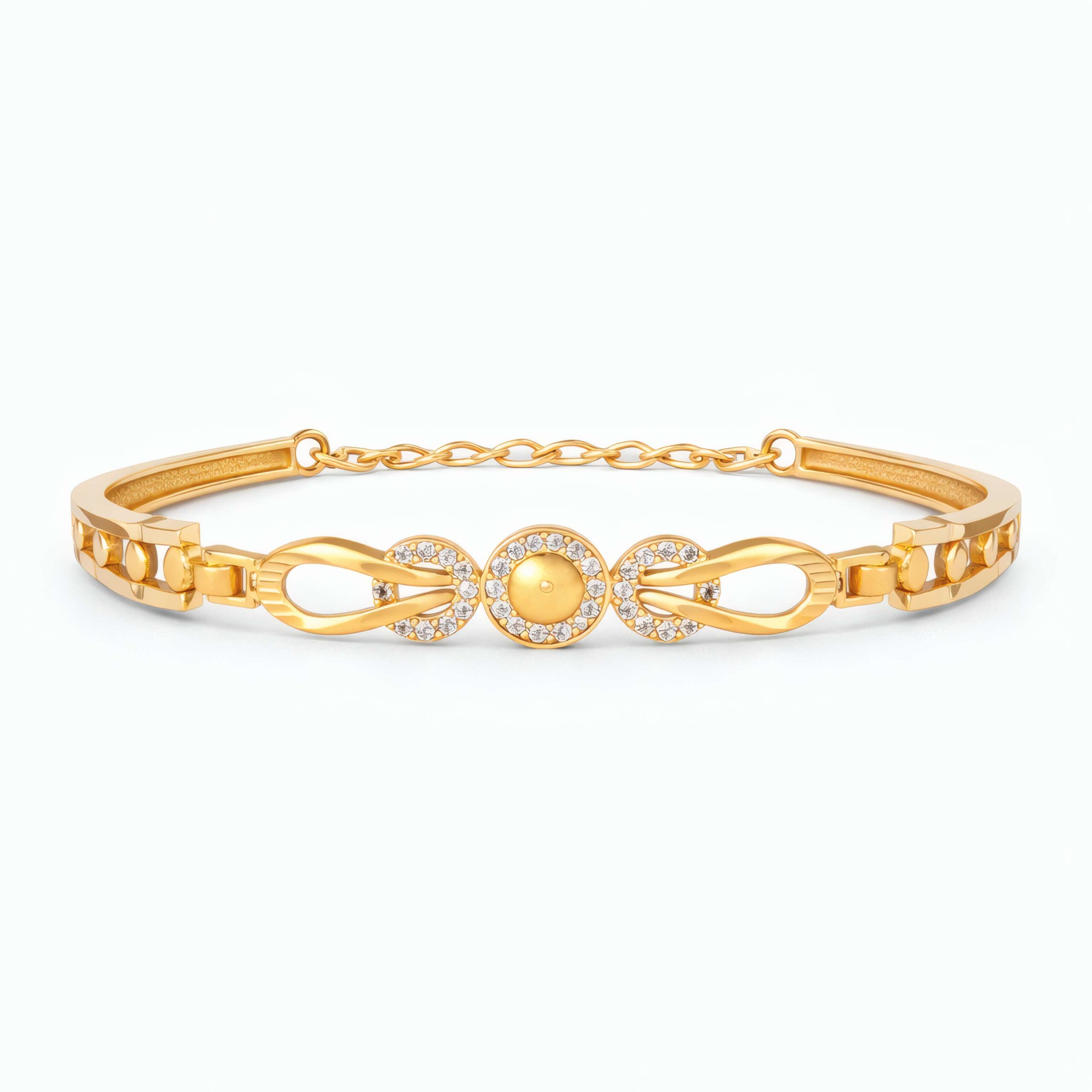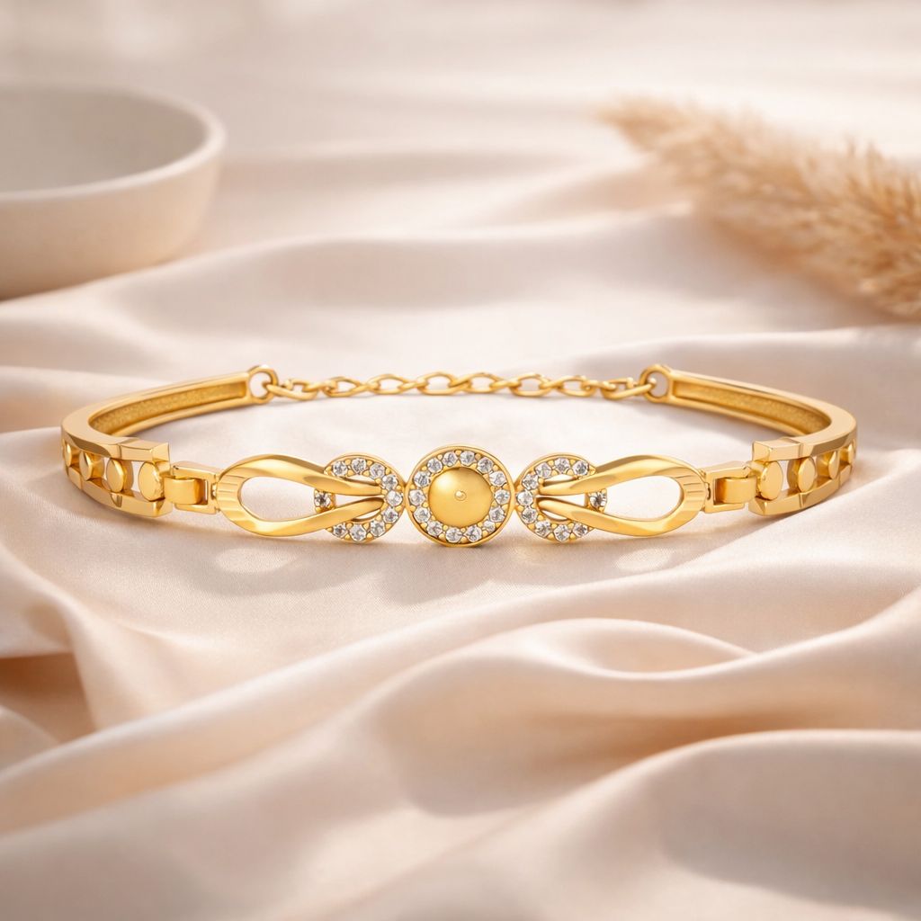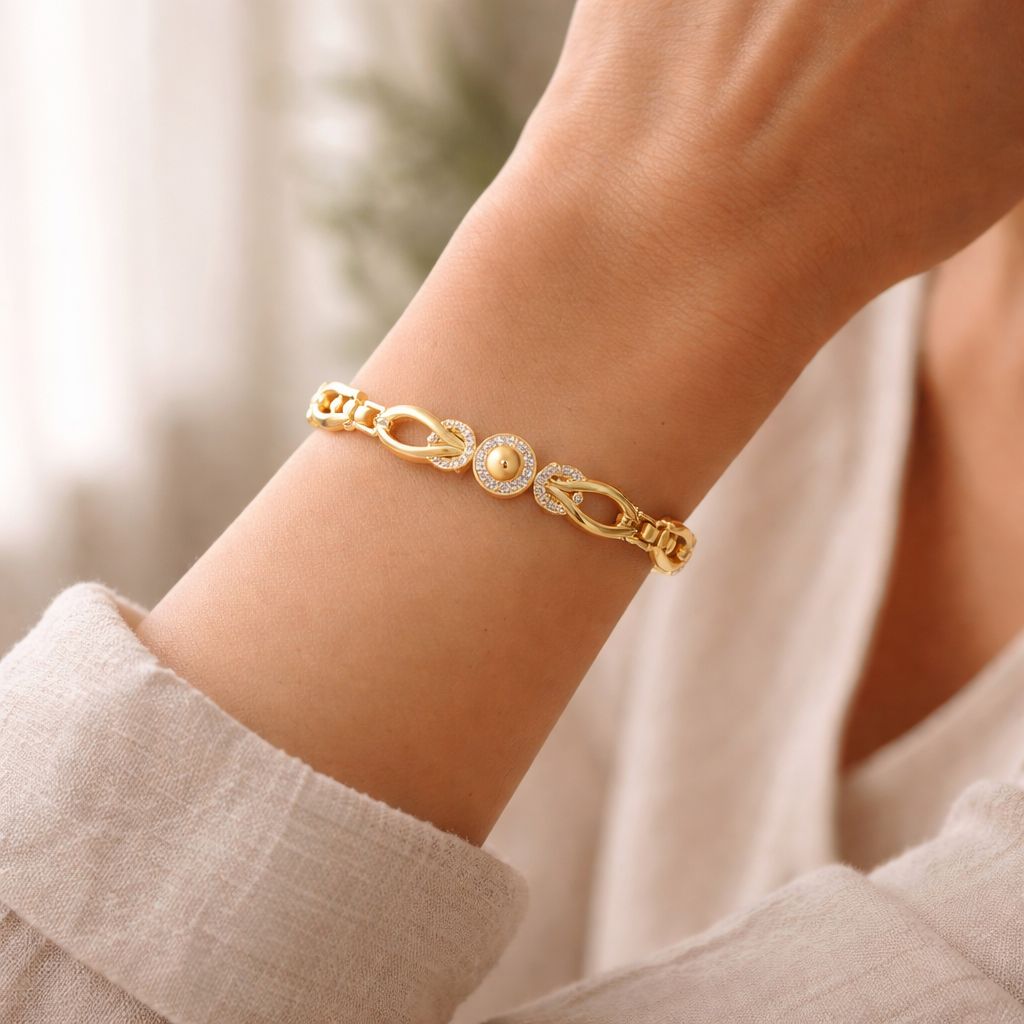 Inspired by the beauty of continuous flow and timeless elegance, this bracelet features a refined infinity-inspired design that symbolizes endless style. At the center, a polished gold circular motif is surrounded by delicate crystals that shimmer softly with every movement.