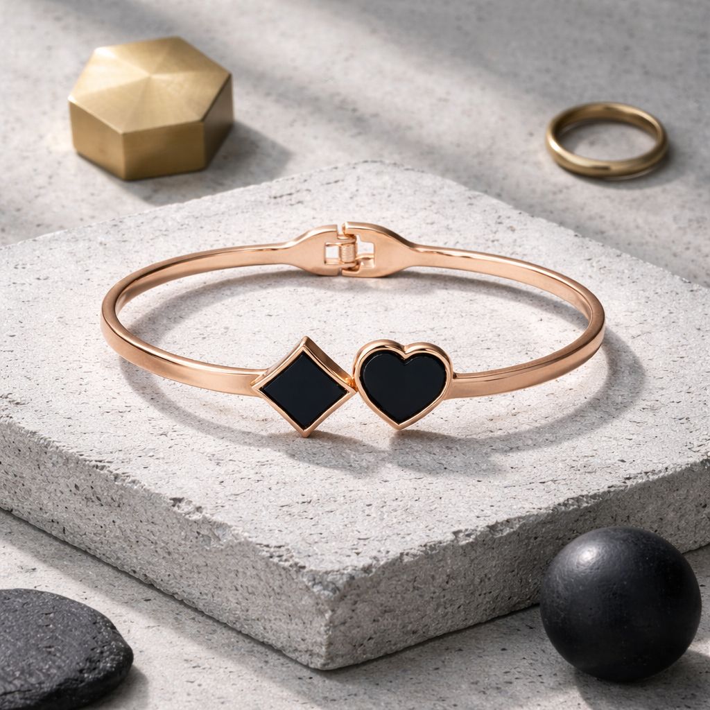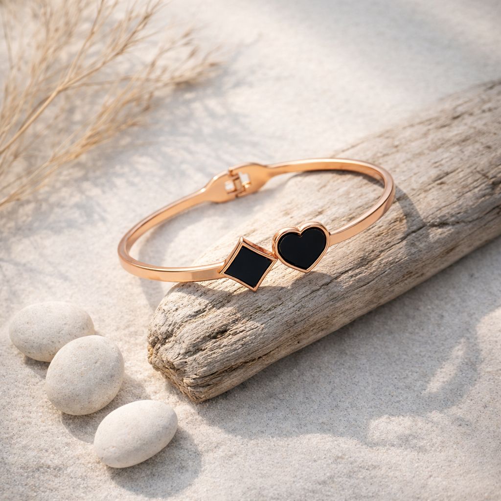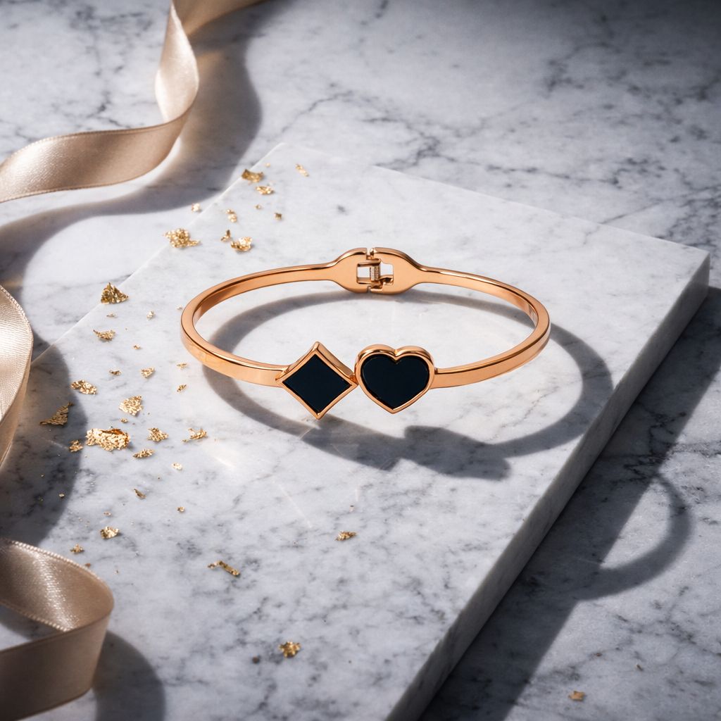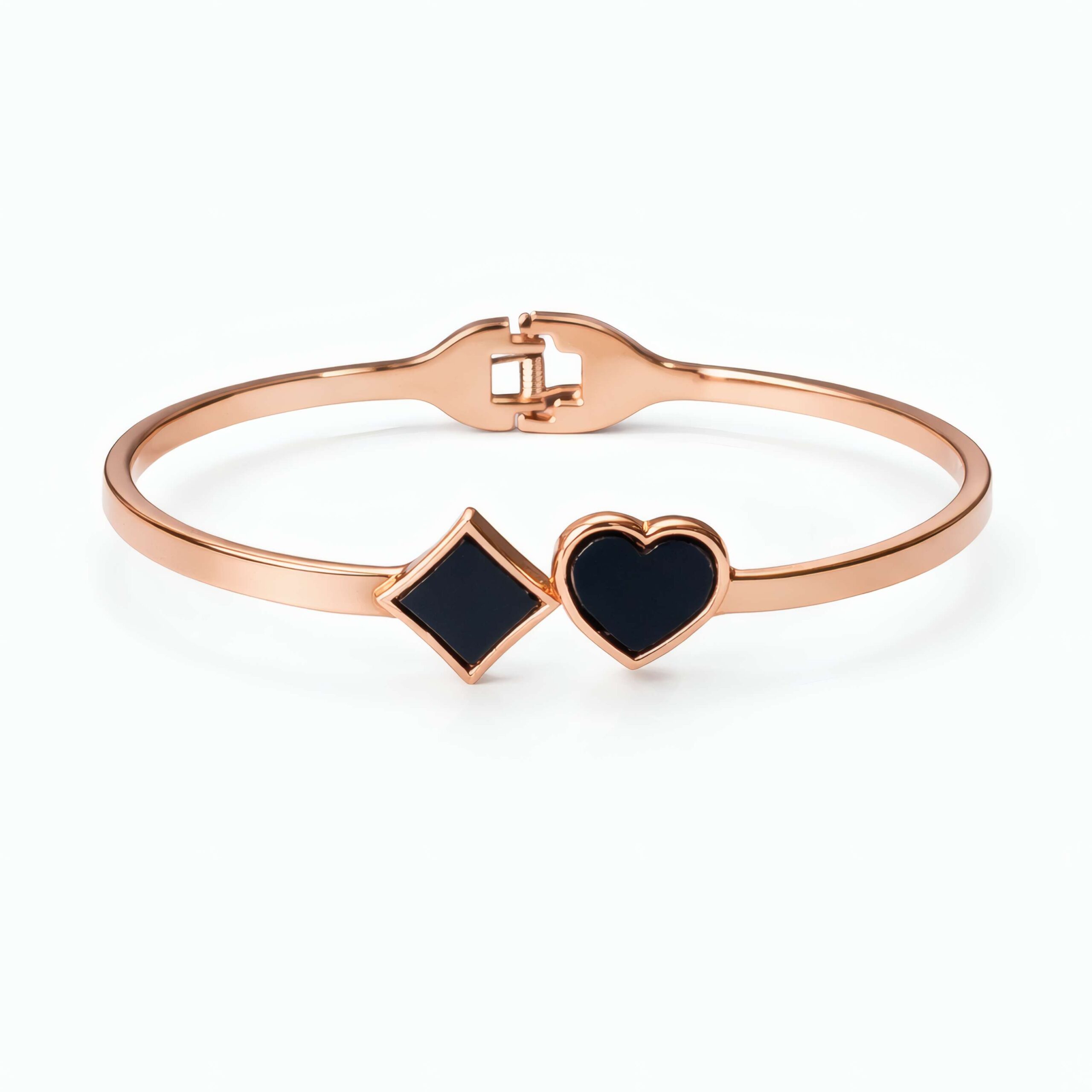 A stylish rose gold bracelet featuring a heart and diamond-shaped charm with black enamel accents, designed for a modern and elegant look.