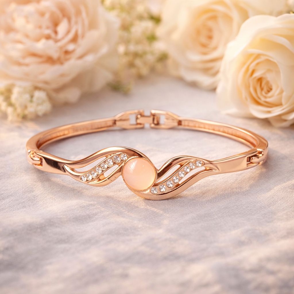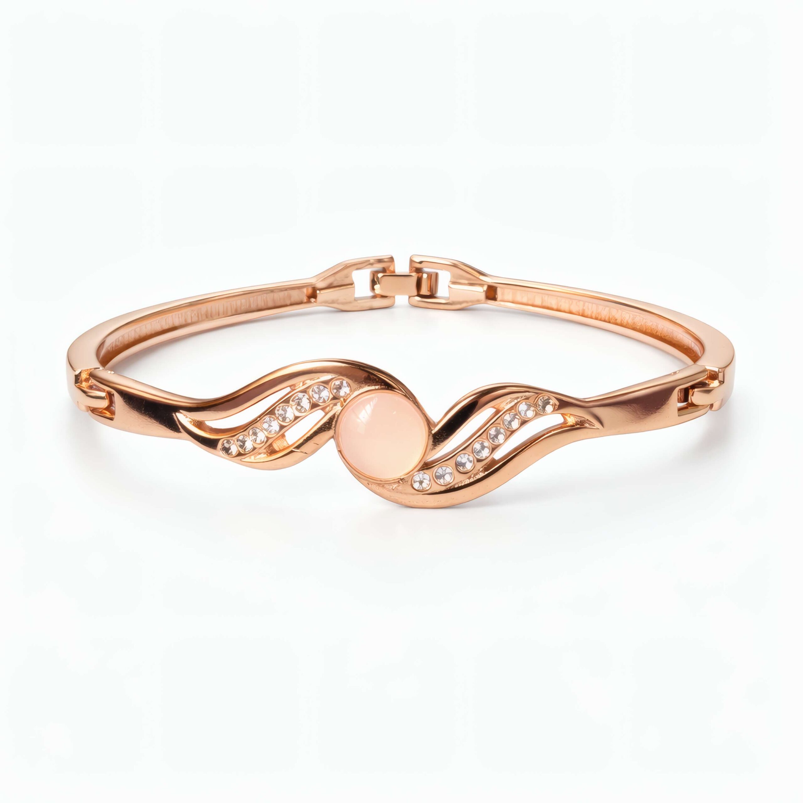 A graceful rose gold bracelet featuring flowing wave curves and sparkling crystal accents. Its soft feminine design adds elegance and charm to any outfit.