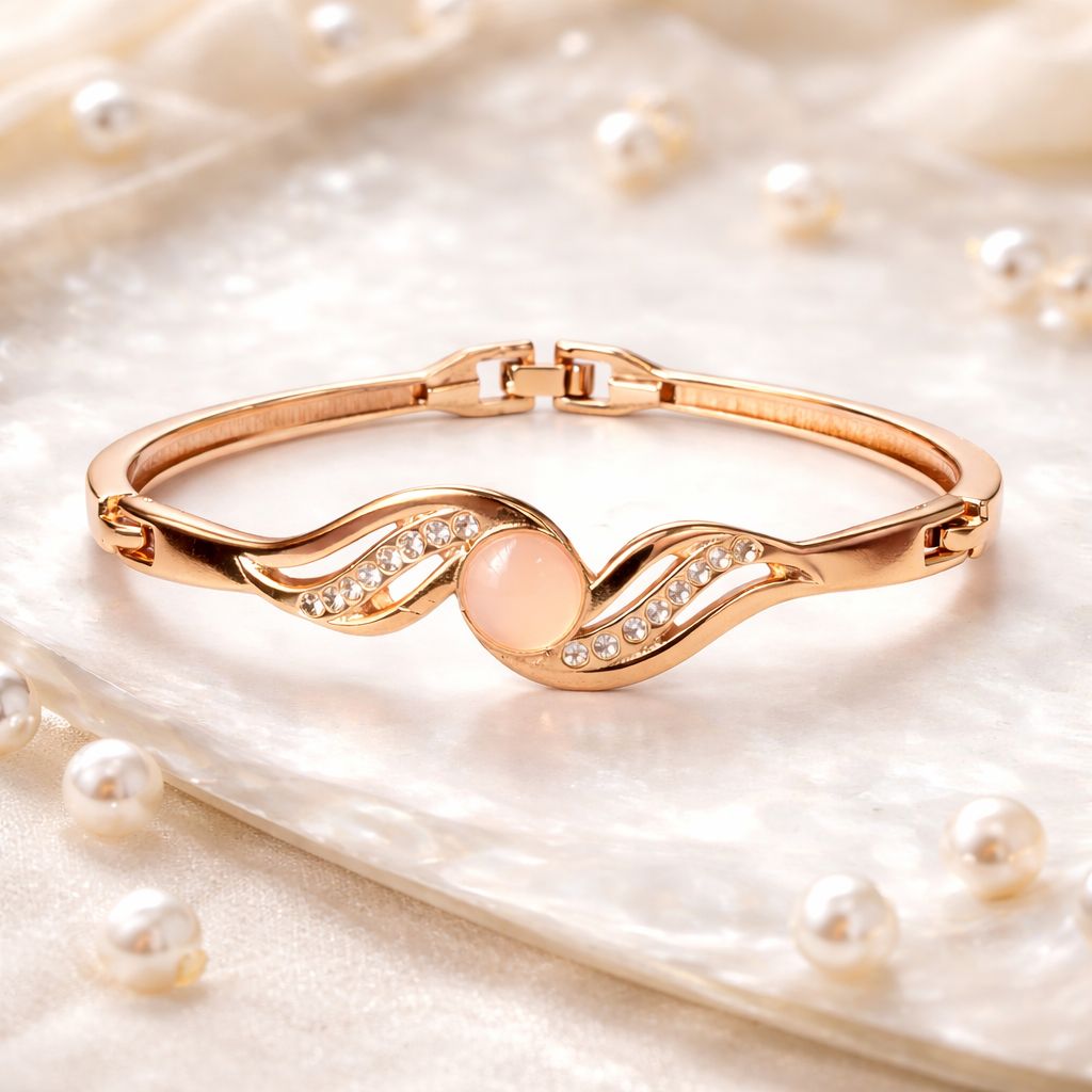 Delicate crystals are embedded along the flowing curves, adding a subtle sparkle that reflects light with every movement. The soft rose gold finish enhances the warmth and elegance of the design, giving the bracelet a luxurious and refined appearance.