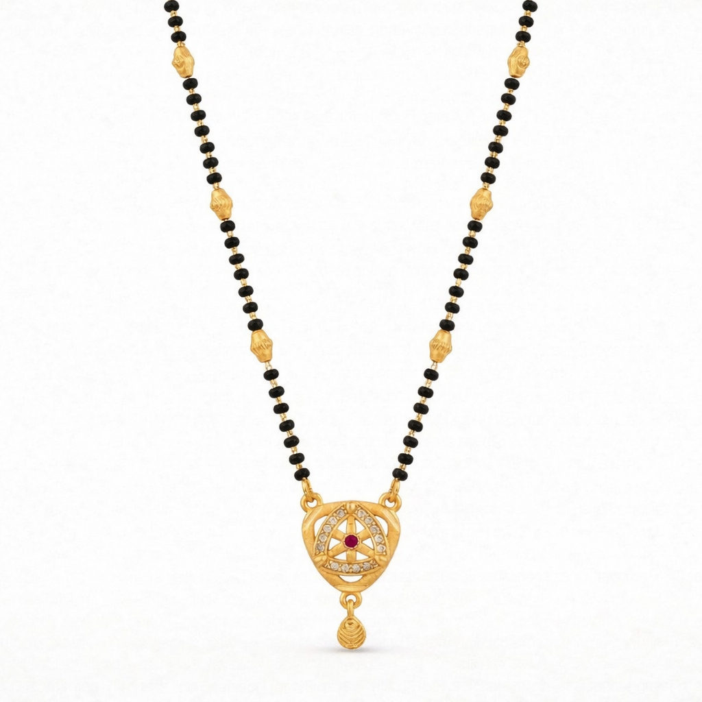 Celebrate timeless beauty with this elegant ruby arc mangalsutra necklace, thoughtfully designed for the modern woman who cherishes tradition. The delicate chain of classic black beads paired with gold-toned textured elements creates a graceful and balanced look that feels both traditional and contemporary.