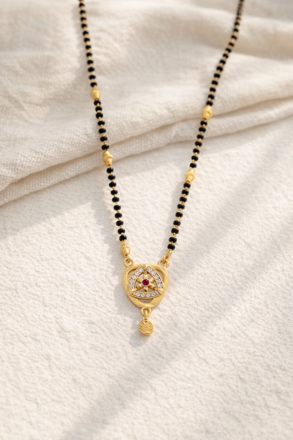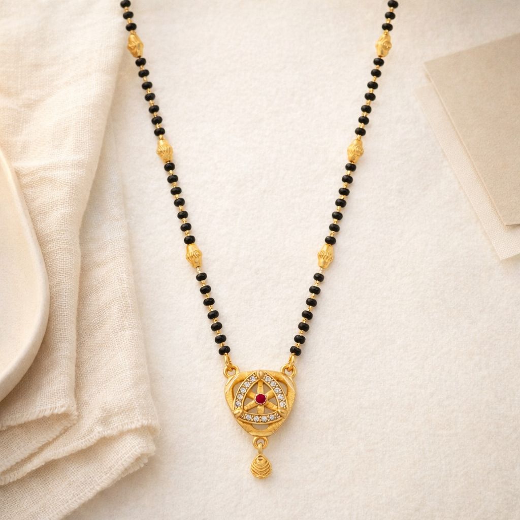 A graceful mangalsutra that blends timeless tradition with delicate modern design. The curved pendant with sparkling stones and a ruby centerpiece adds a refined touch of elegance to your everyday look.