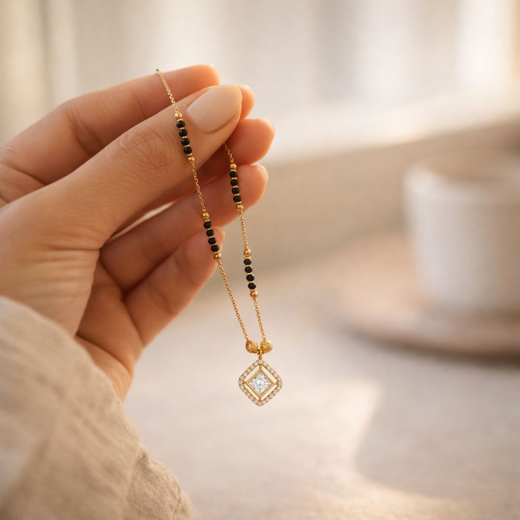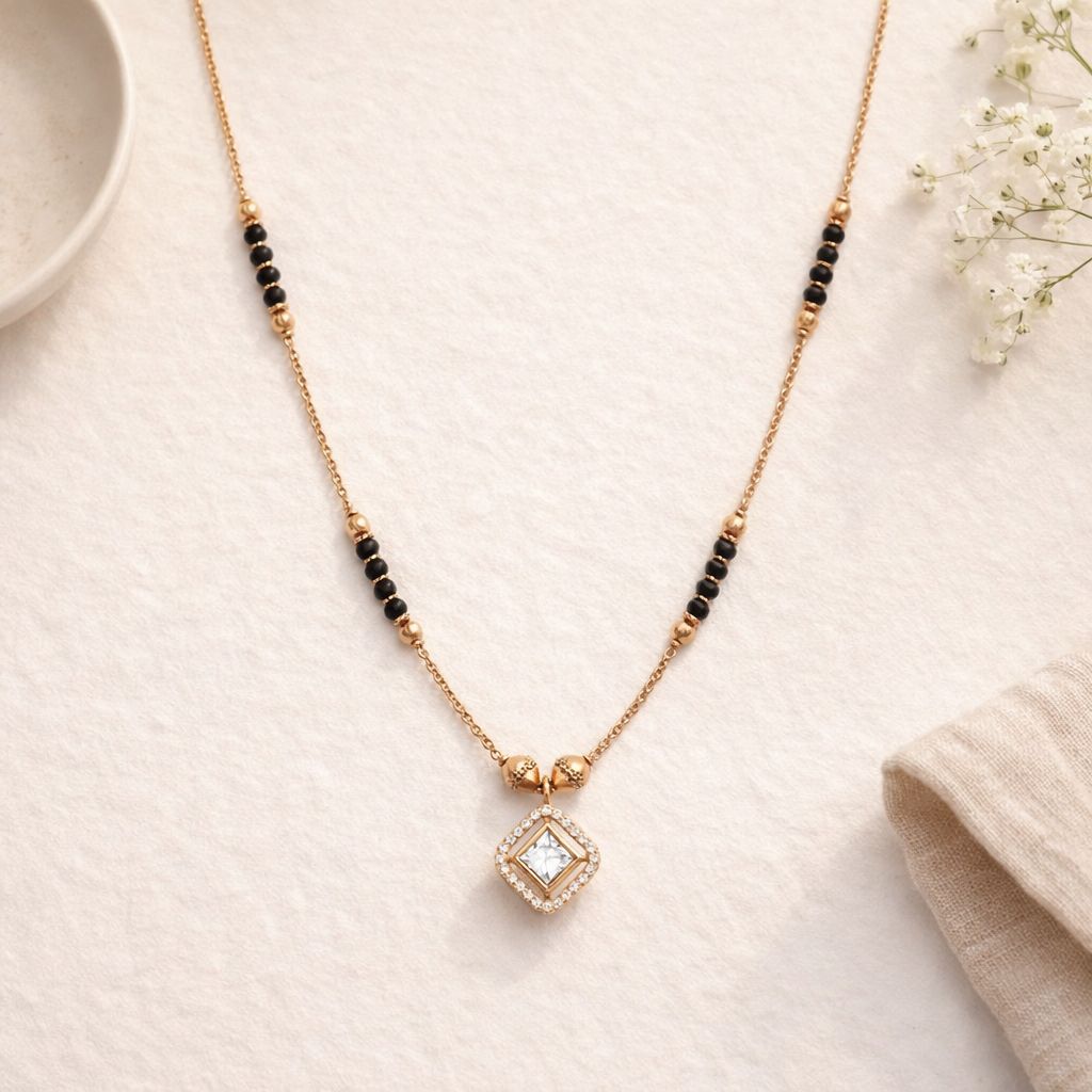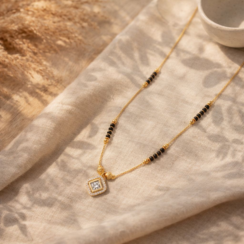 A beautifully crafted gold plated mangalsutra featuring delicate black beads and a sparkling square diamond-style pendant. Perfect for modern women who love minimal yet elegant traditional jewellery.