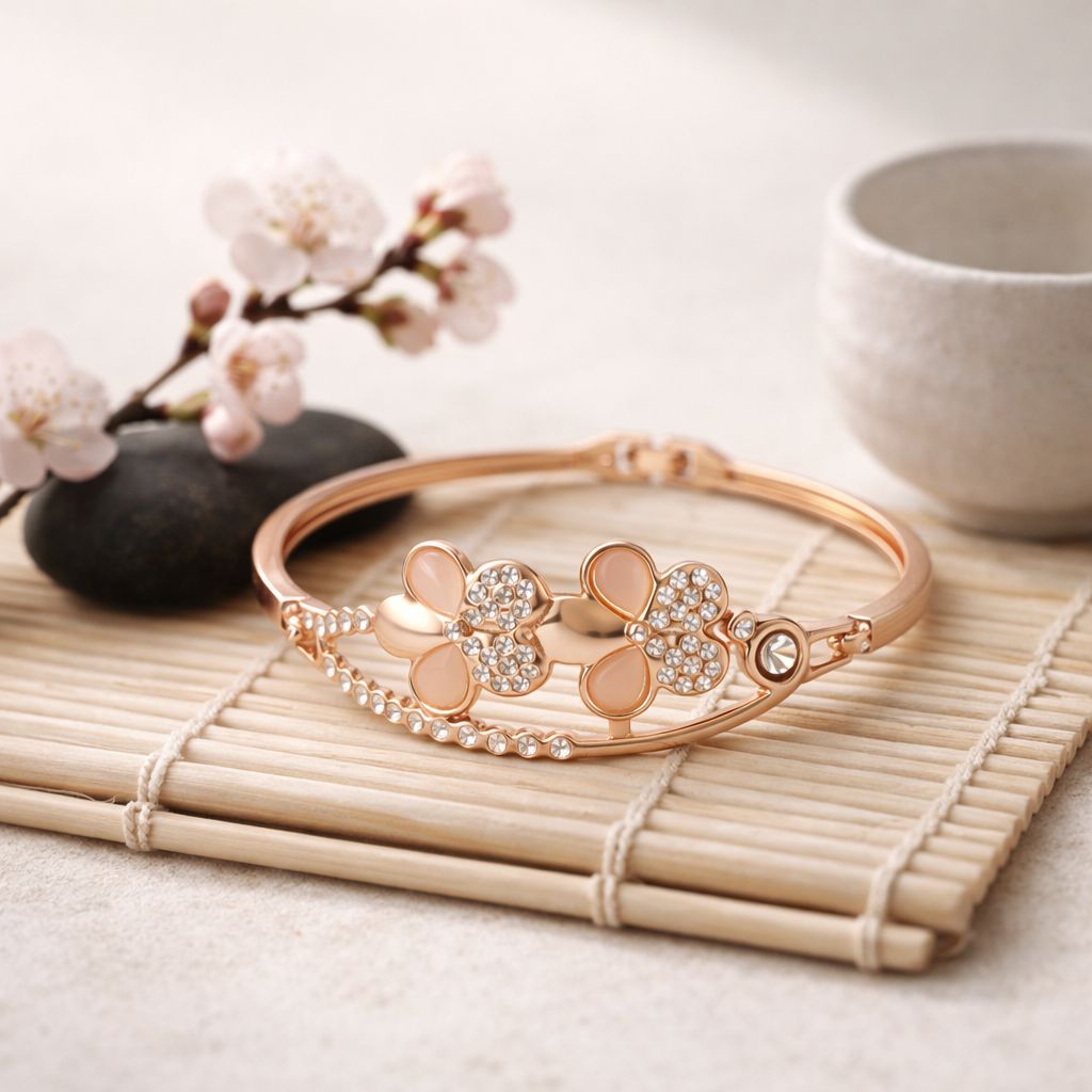 Inspired by the soft beauty of blooming flowers, this elegant gold plated bracelet captures feminine charm in a graceful design. The centerpiece features delicate floral motifs beautifully crafted with smooth petal accents and sparkling crystal stones that catch the light with every movement.