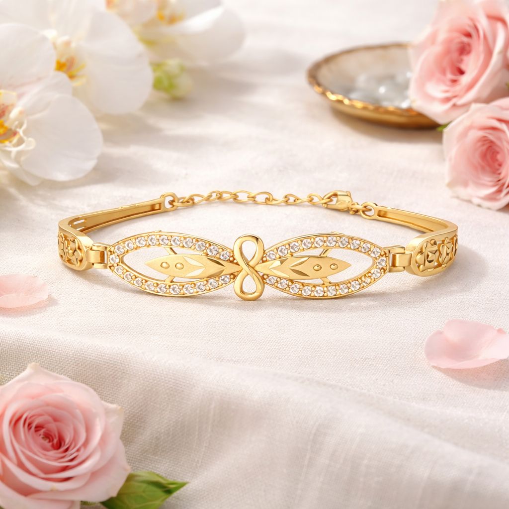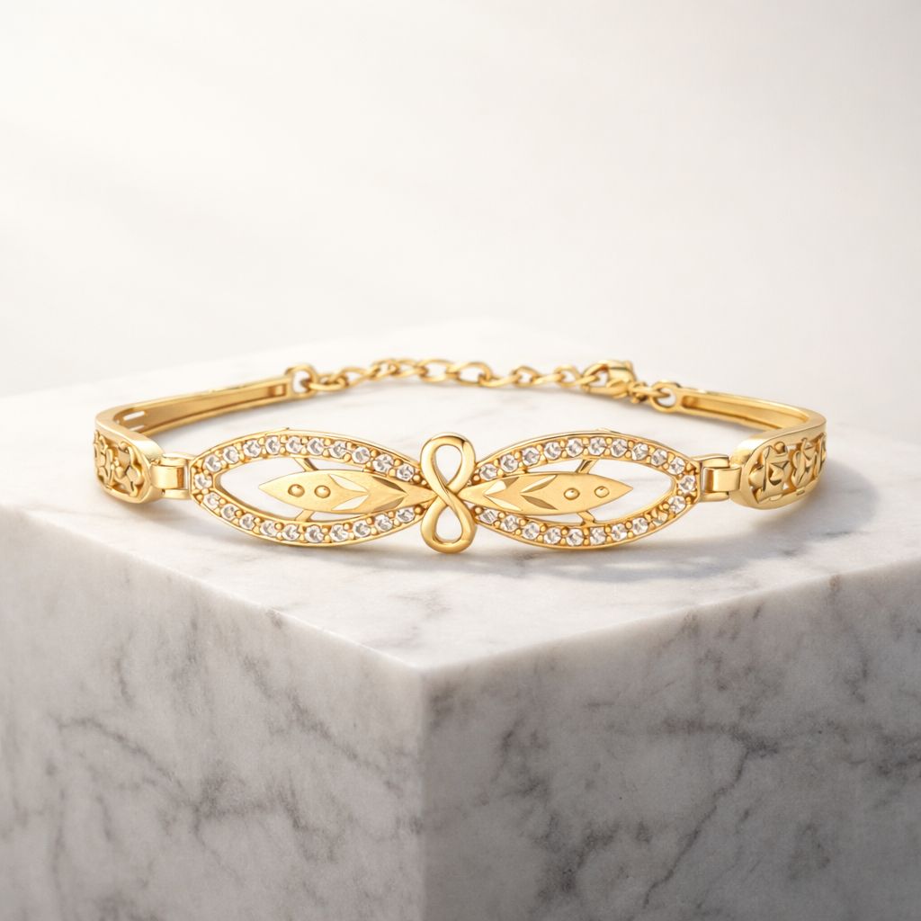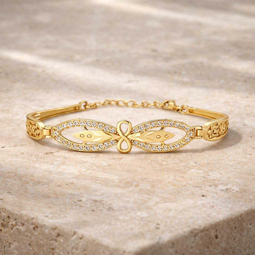 Inspired by the beauty of infinite elegance, this stunning gold bracelet features a delicate infinity motif that represents timeless style and endless grace. The design flows beautifully across the wrist, highlighted by sparkling crystal-lined curves that create a soft shimmer with every movement.