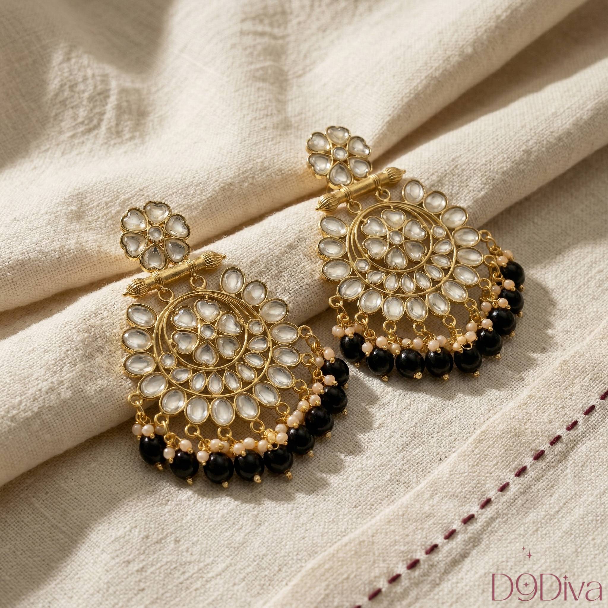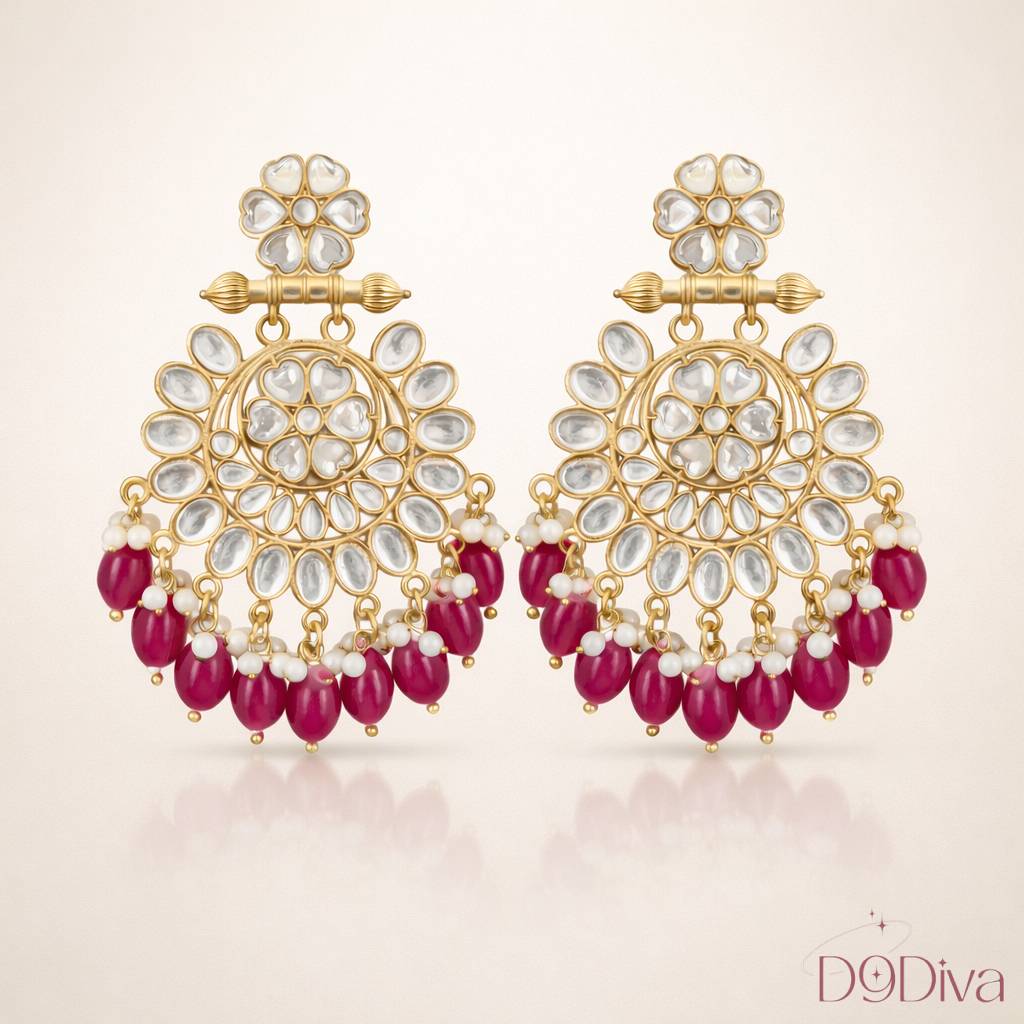 Featuring intricate kundan stone work arranged in a floral mandala pattern, the design beautifully reflects light, adding a subtle glow to your look. The classic chandbali silhouette is enhanced with delicate bead drops, creating movement and charm with every step you take.