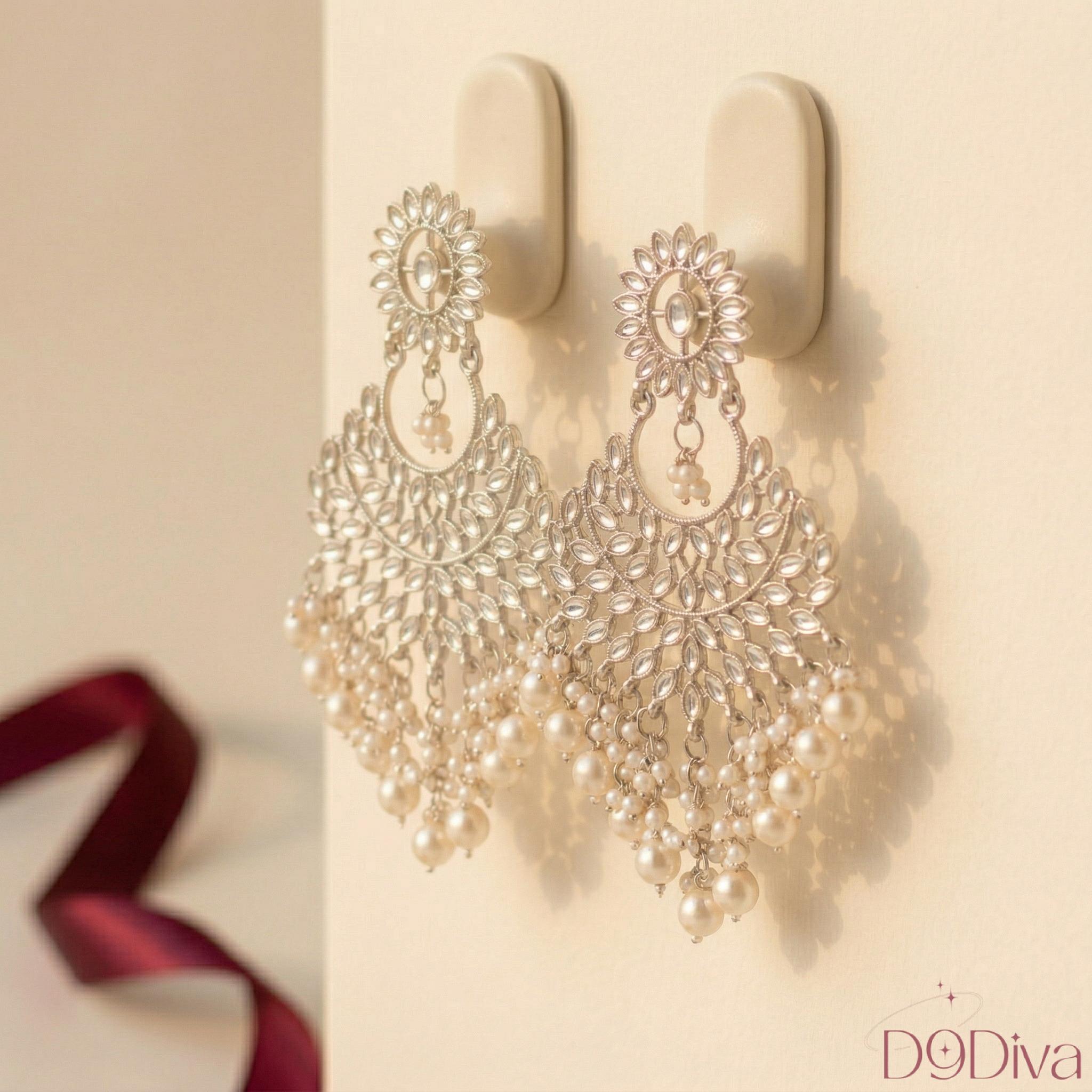 Elegant floral kundan chandelier earrings crafted for a stunning, statement look. Perfect for weddings, festive wear, and special occasions.