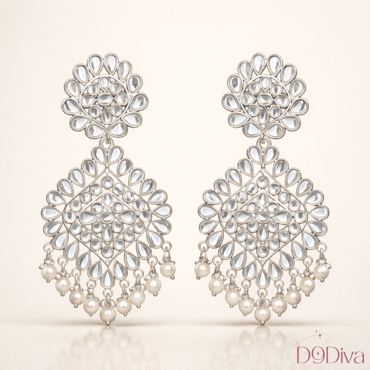 Step into timeless elegance with these stunning Kundan Pearl Chandbali Earrings, designed to make every moment feel special. Inspired by classic Indian artistry, these earrings feature intricate kundan-style stonework arranged in a graceful floral and geometric pattern, finished with delicate pearl drops that sway beautifully with every movement.