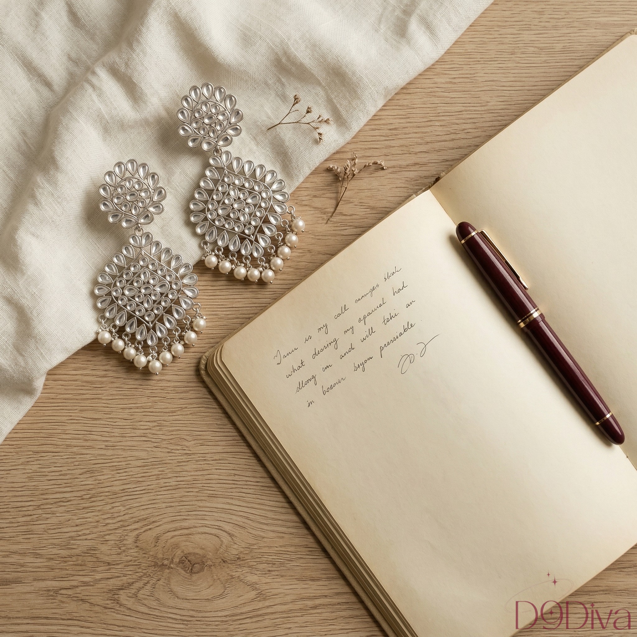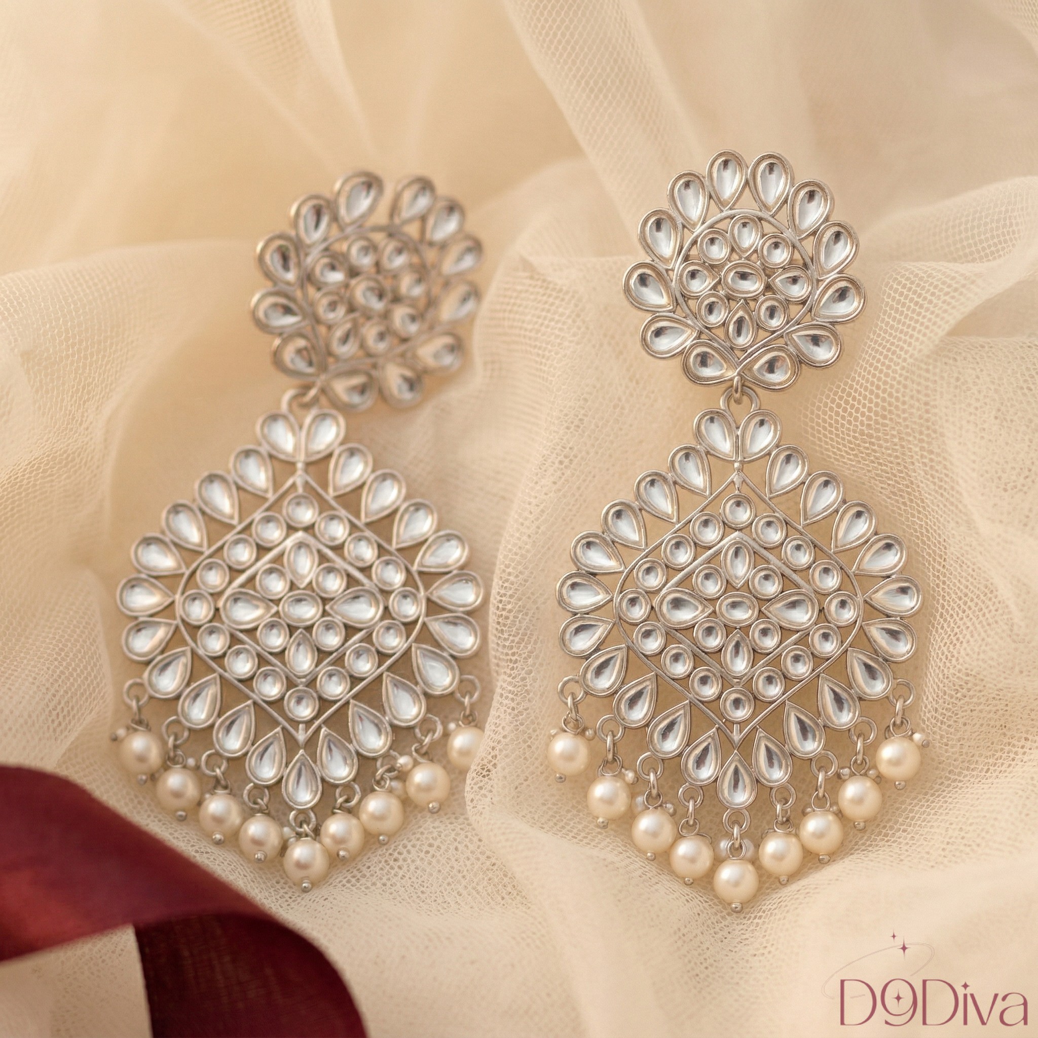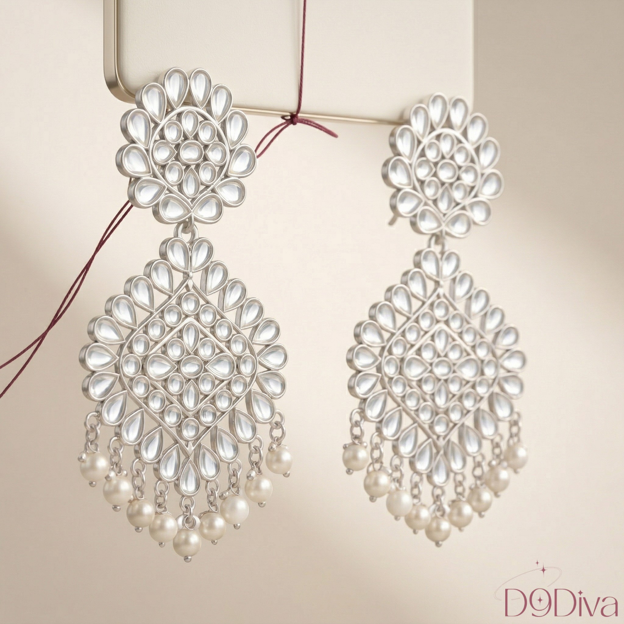 The soft sheen of the stones paired with lustrous pearls creates a luxurious yet modern look—perfect for women who love statement jewellery with a refined touch. Whether you’re dressing up for a festive celebration, wedding function, or an evening party, these earrings instantly elevate your outfit with effortless charm.