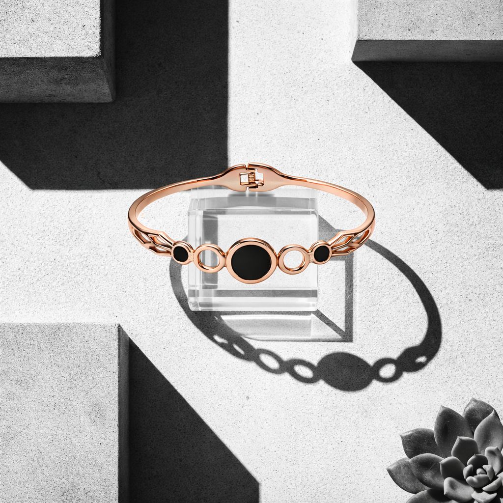 The smooth gold-toned band enhances the bracelet’s luxurious appearance while maintaining a lightweight and comfortable fit on the wrist. The contrasting black stones add depth and drama to the design, making it perfect for women who appreciate minimal yet impactful jewellery.
