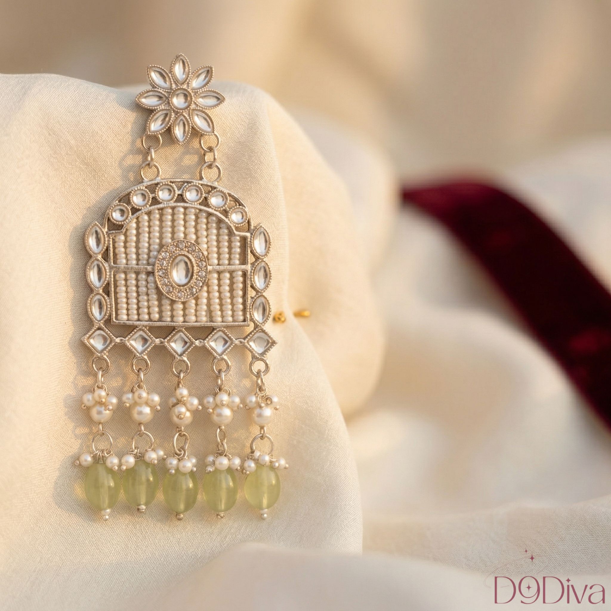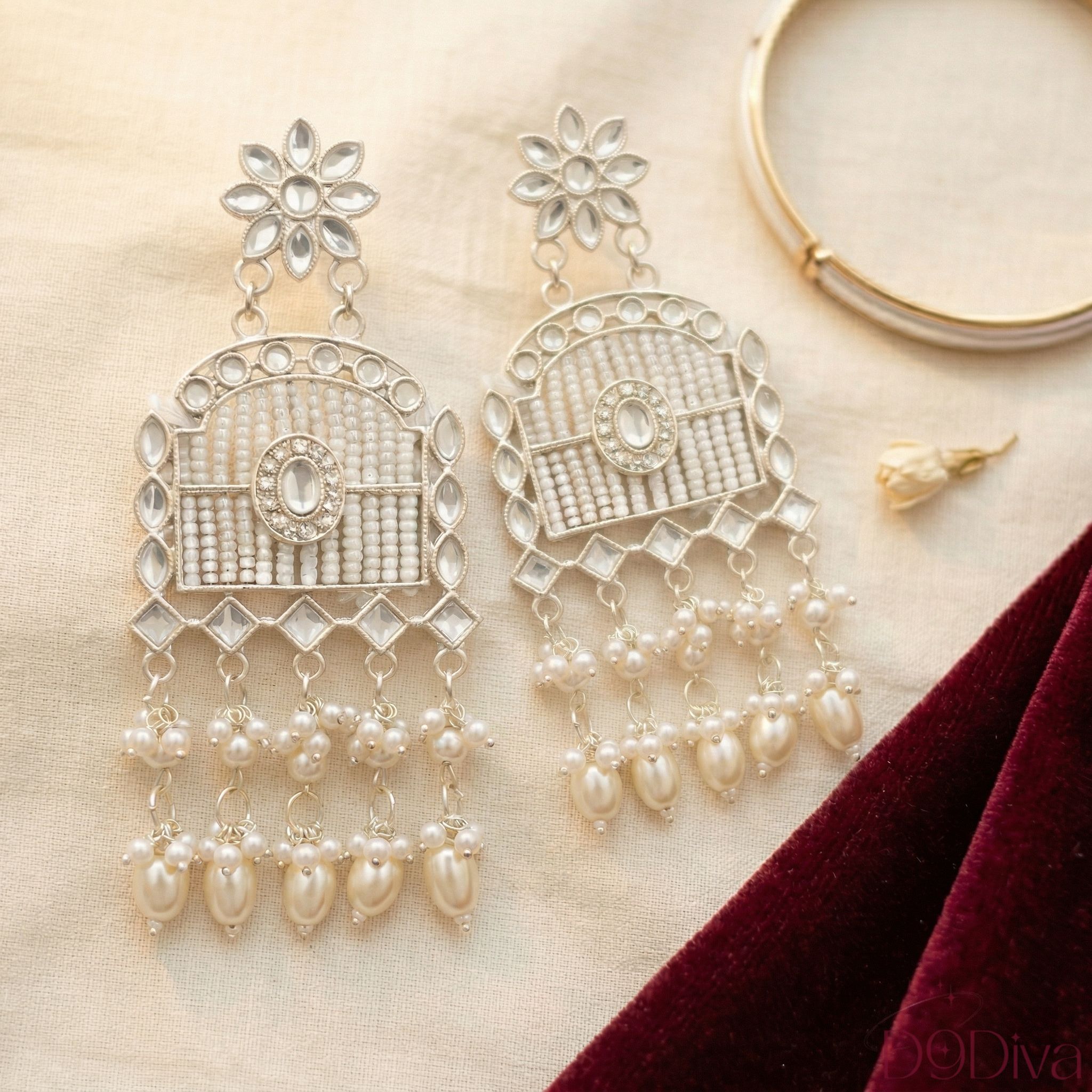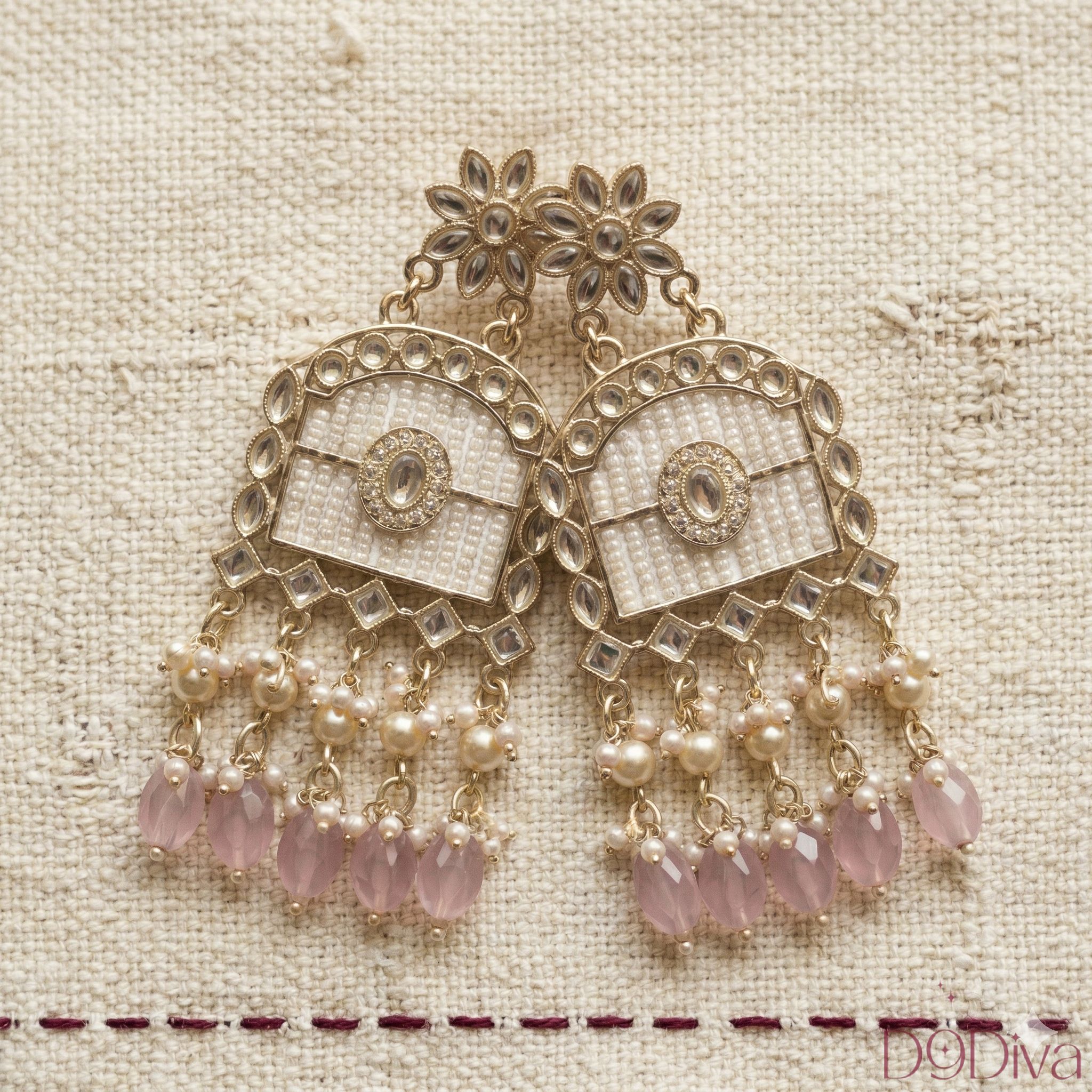 Inspired by floral motifs and heritage jewellery, the design features a delicate stud top, followed by a structured chandelier frame adorned with fine beadwork and luminous pearls. The cascading drops add fluid movement, creating a soft, feminine sway with every step.