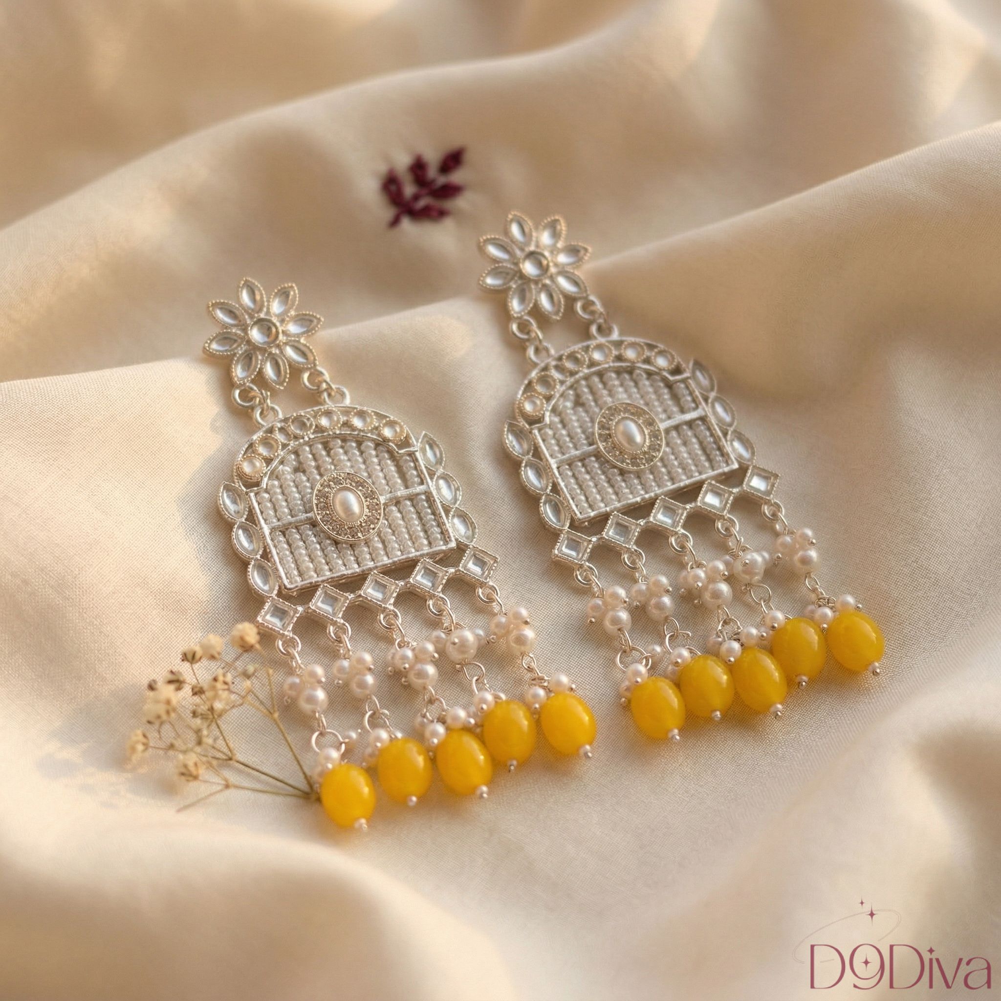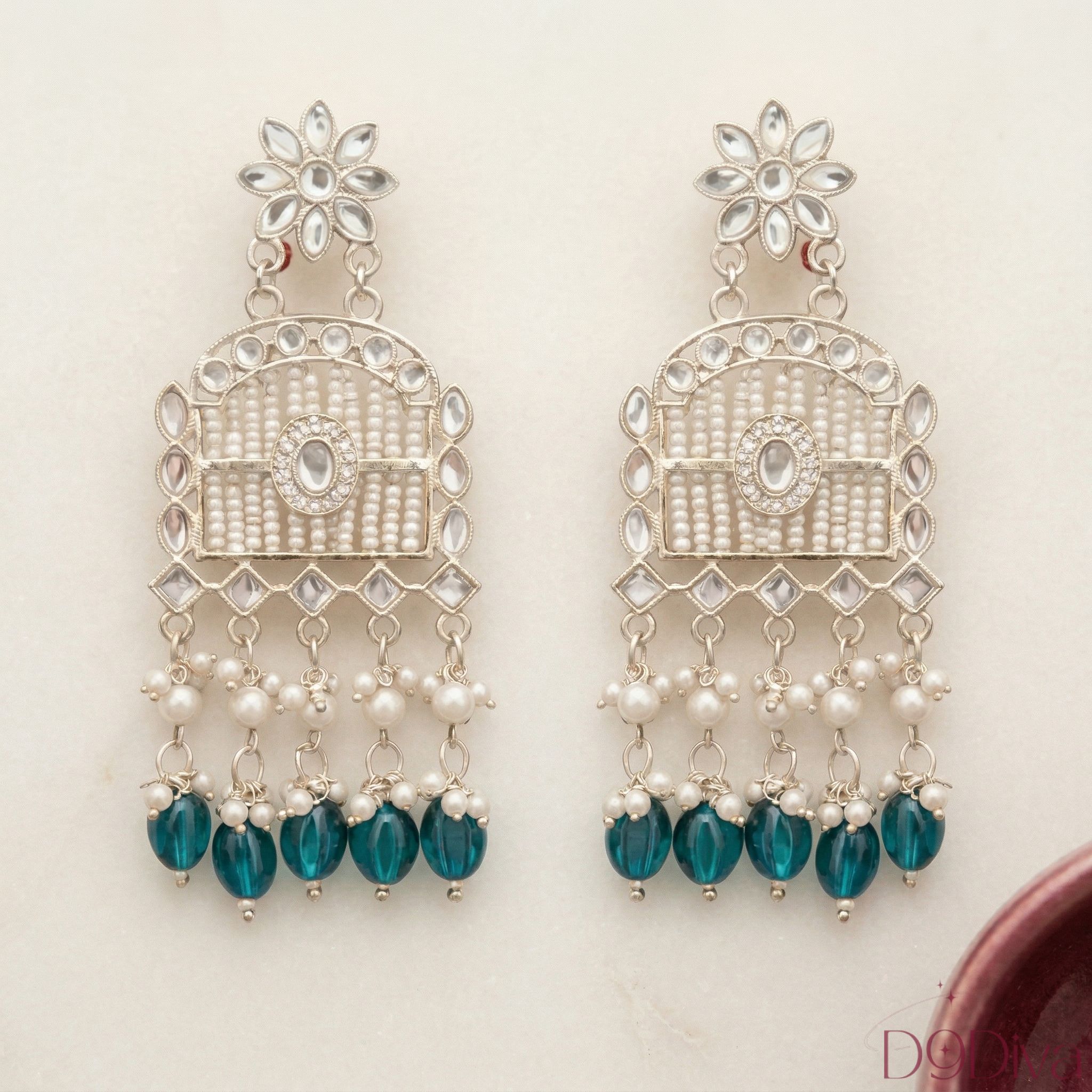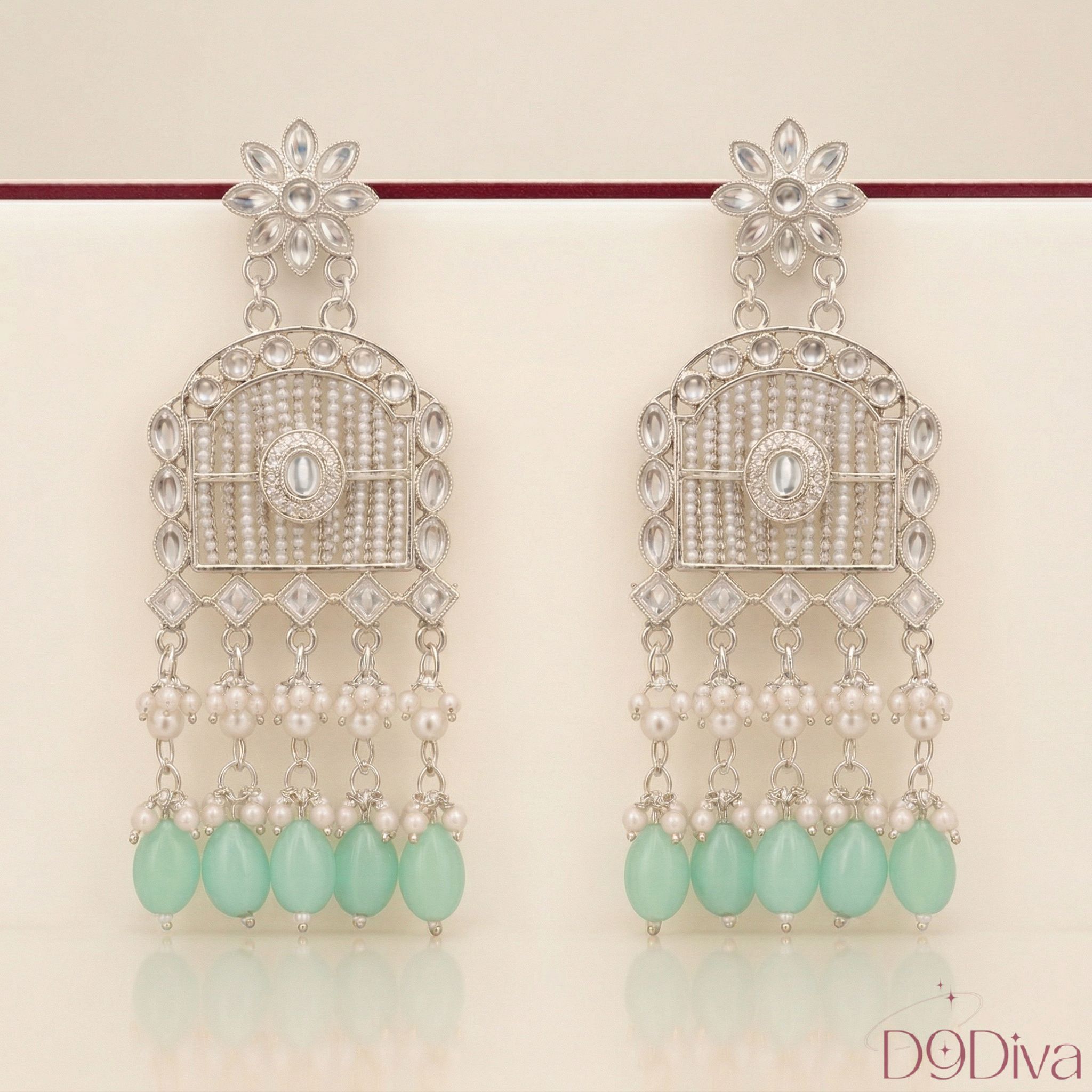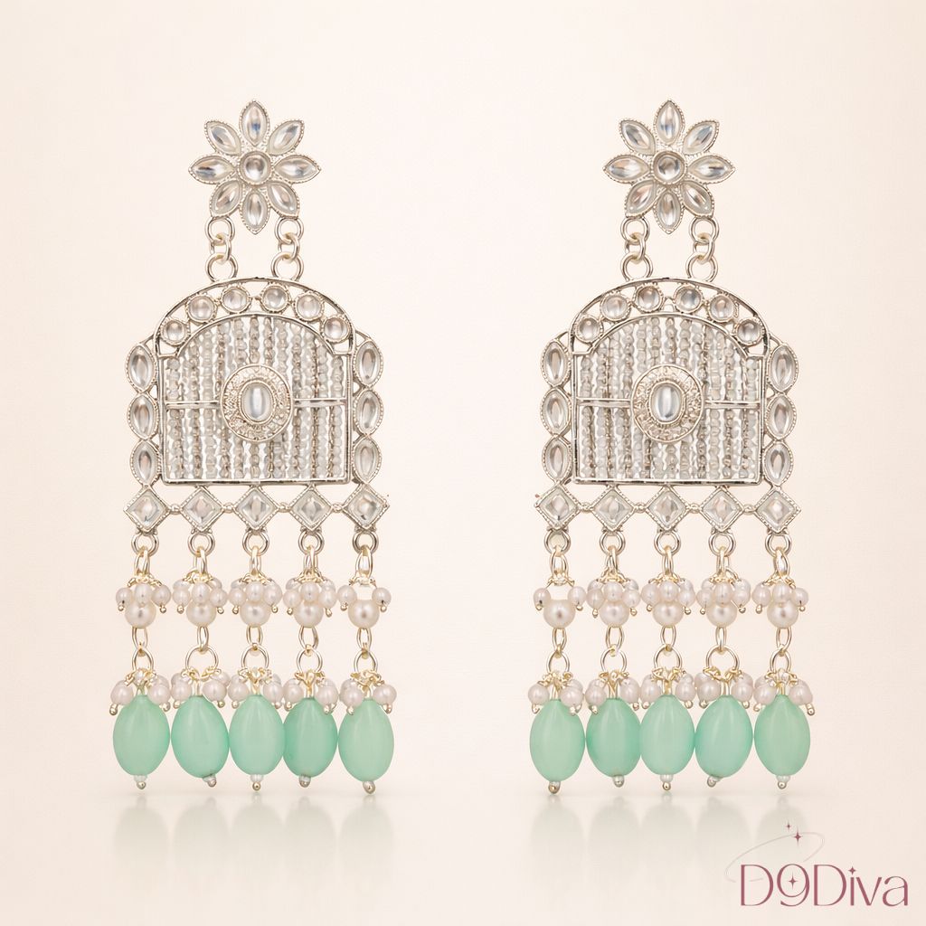 Inspired by floral motifs and heritage jewellery, the design features a delicate stud top, followed by a structured chandelier frame adorned with fine beadwork and luminous pearls. The cascading drops add fluid movement, creating a soft, feminine sway with every step.