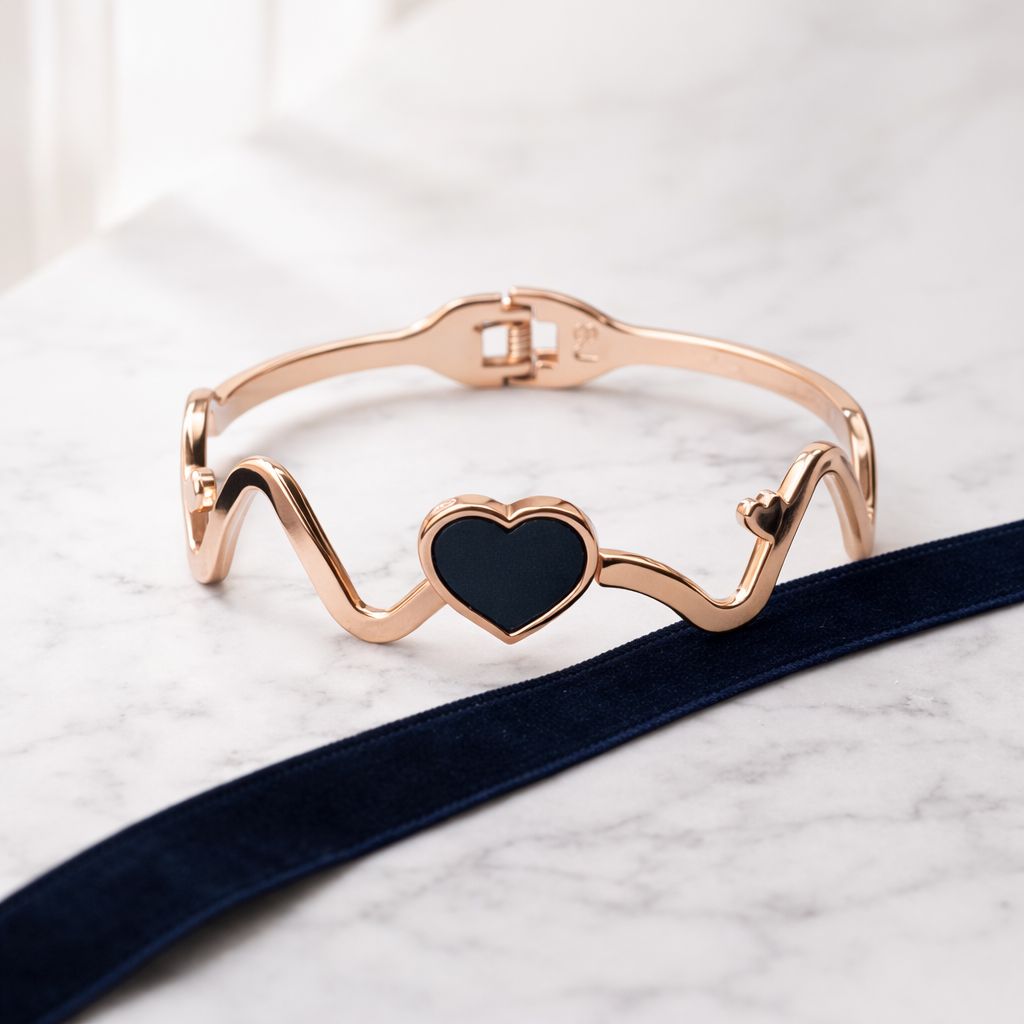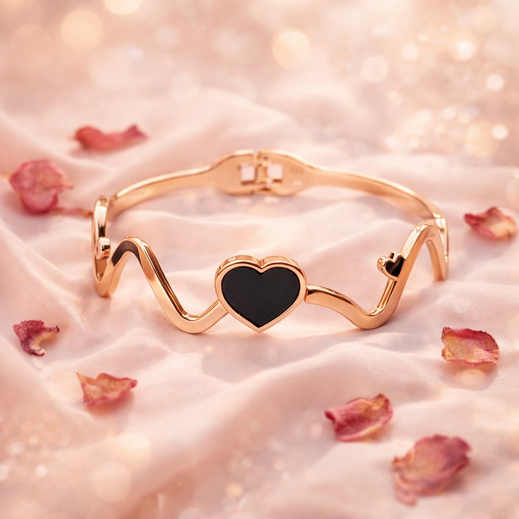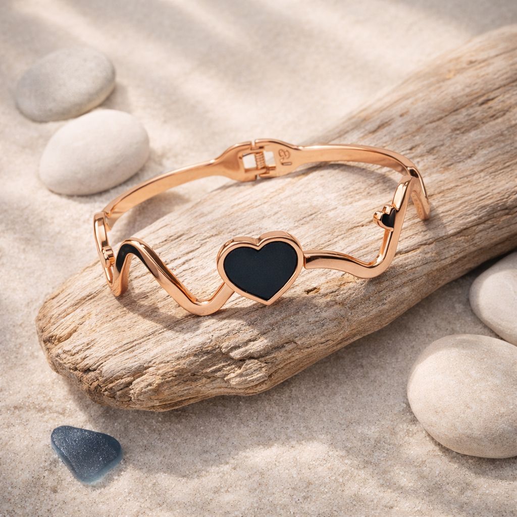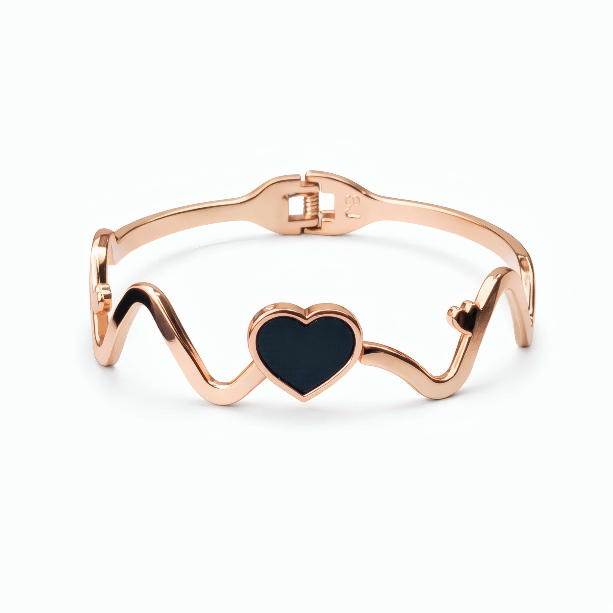 Express elegance and romance with this beautifully designed rose gold heart wave bracelet. The bracelet features a charming heart-shaped centerpiece with a sleek enamel-style finish that adds depth and contrast to the warm rose gold tone.
