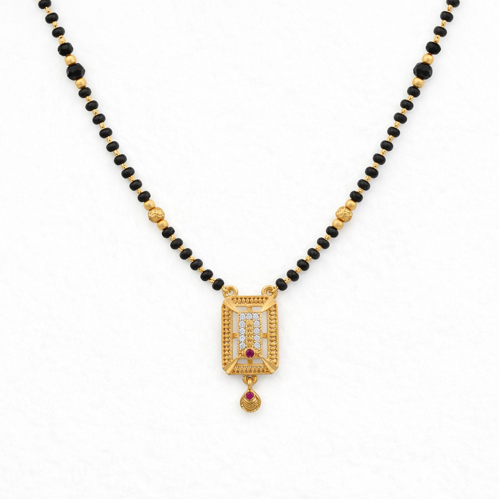 Elegant and timeless, this rectangular crystal mangalsutra pendant reflects classic charm with a modern edge. The sparkling crystals and ruby accent create a graceful statement for everyday elegance.